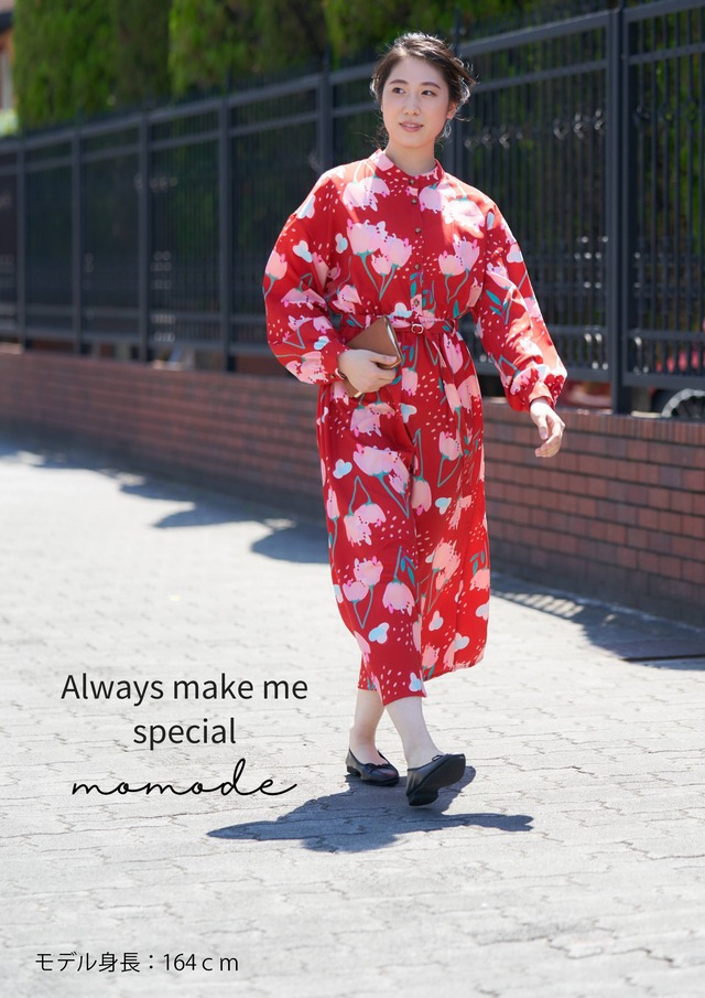 赤色が品よく映える【soyokaze】のワンピースは きれいめでお出かけするのにぴったり。 友達との旅行やランチ会など ちょっぴり目立ちたいときに選びたいかも。 スタンドカラーで落ち着いたデザインは 大人スタイルで上品。 カジュアル過ぎないところがGOOD。 袖口やウエスト廻りにはギャザーを使って 柔らかく優しいイメージの一着に。 ウエストのサッシュのベルトも使いやすいね。 しっかりした厚手のサテン地は オールシーズン使えて便利な素材。 ポリエステル100%でシワになりにくいです。 少し気になるワンピース丈 お好みの丈の長さを選んでいただけるように 二種類ご用意させて頂きました。 着丈 120cmのレギュラー丈と 125cmのロング丈。 あなたはどっちの丈をチョイス? 『商品サイズ』 フリーサイズ(着丈のみ2サイズです) バスト:110cm ウエスト:100cm(ゴム仕上70cm) 着丈:(R)120cm、(L)125cm 裄丈:84cm 袖巾:23cm 袖口:22cm 裾廻り(R)192cm、(L)200cm ※両脇にシームポケット 『素材について』 ポリエステル 100% 『生産国』 日本製 / 製造・販売:アトリエ工房アンジュ 『発送について』 当商品はアトリエ工房アンジュより ゆうパックでお届けします。 『お手入れについて』 液温は30度を限度し、洗濯ネットを使用し、弱水流で洗濯してください。 塩素系及び酸素系の漂白剤の使用は避けてください。 自然乾燥するときは日陰のつり干し、アイロンは底面温度150度を限度としアイロン仕上げができます。 『その他特記事項』 ・カラーについては出来る限り本来の色を忠実に掲載しておりますが、ディスプレイ環境によって色味が異なって見える場合がございますことをご了承ください。